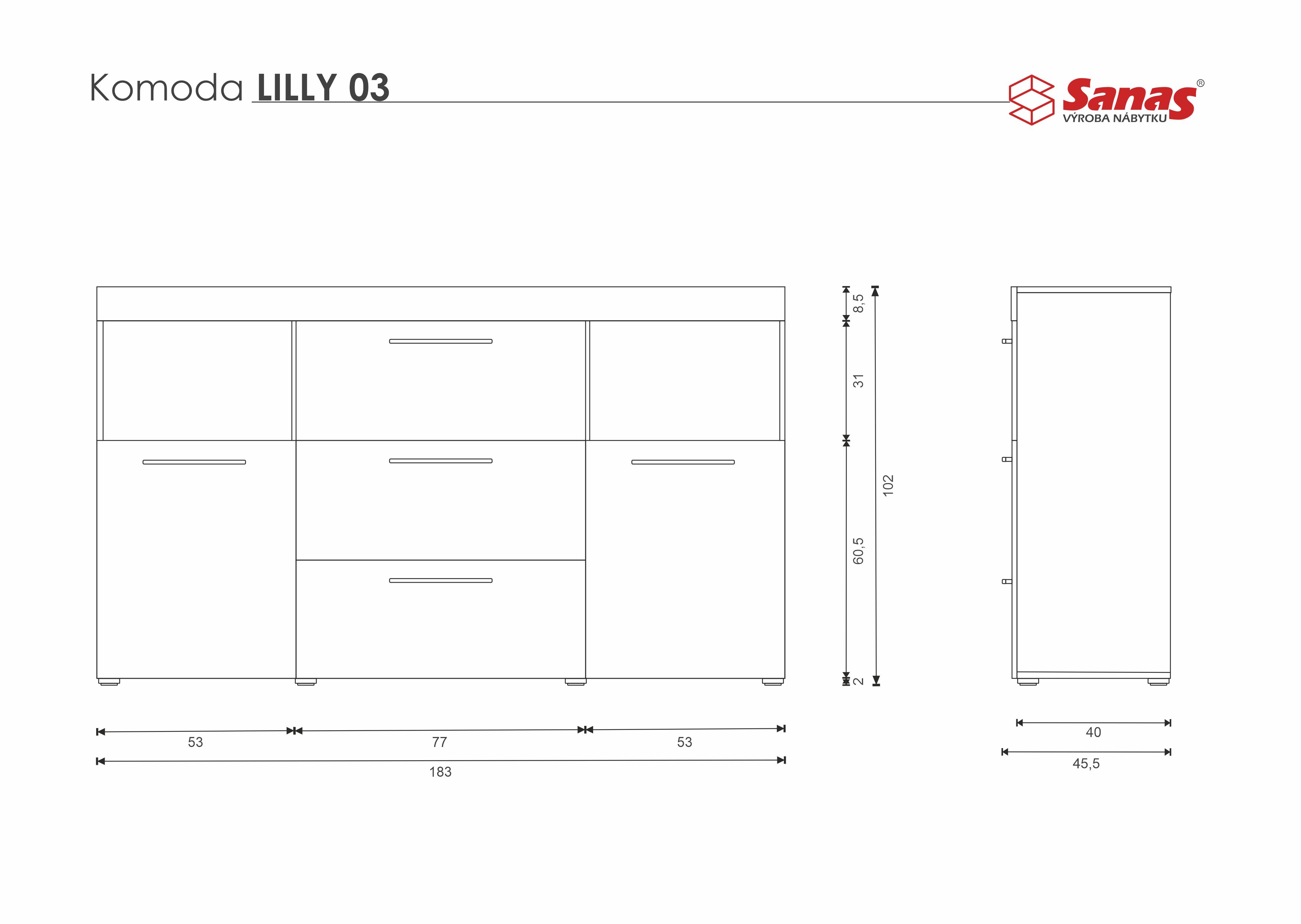 Klasická komoda v prevedení korpus materiál 18 mm LDTD Roble, Dub Sonoma a predné plochy Dub Sonoma, alebo MDF fóliovaná bielou a čiernou termofóliou s vysokým leskom, poprípade širokou škálou dekorov a farieb z folií ponúkaných v kuchynskom sortimente. Samozrejmosťou je tlmenie dverí v cene. Prednosťou komôd Lilly je elegantný, klasický dizajn a veľký úložný priestor vďaka hĺbke až 420 mm.
