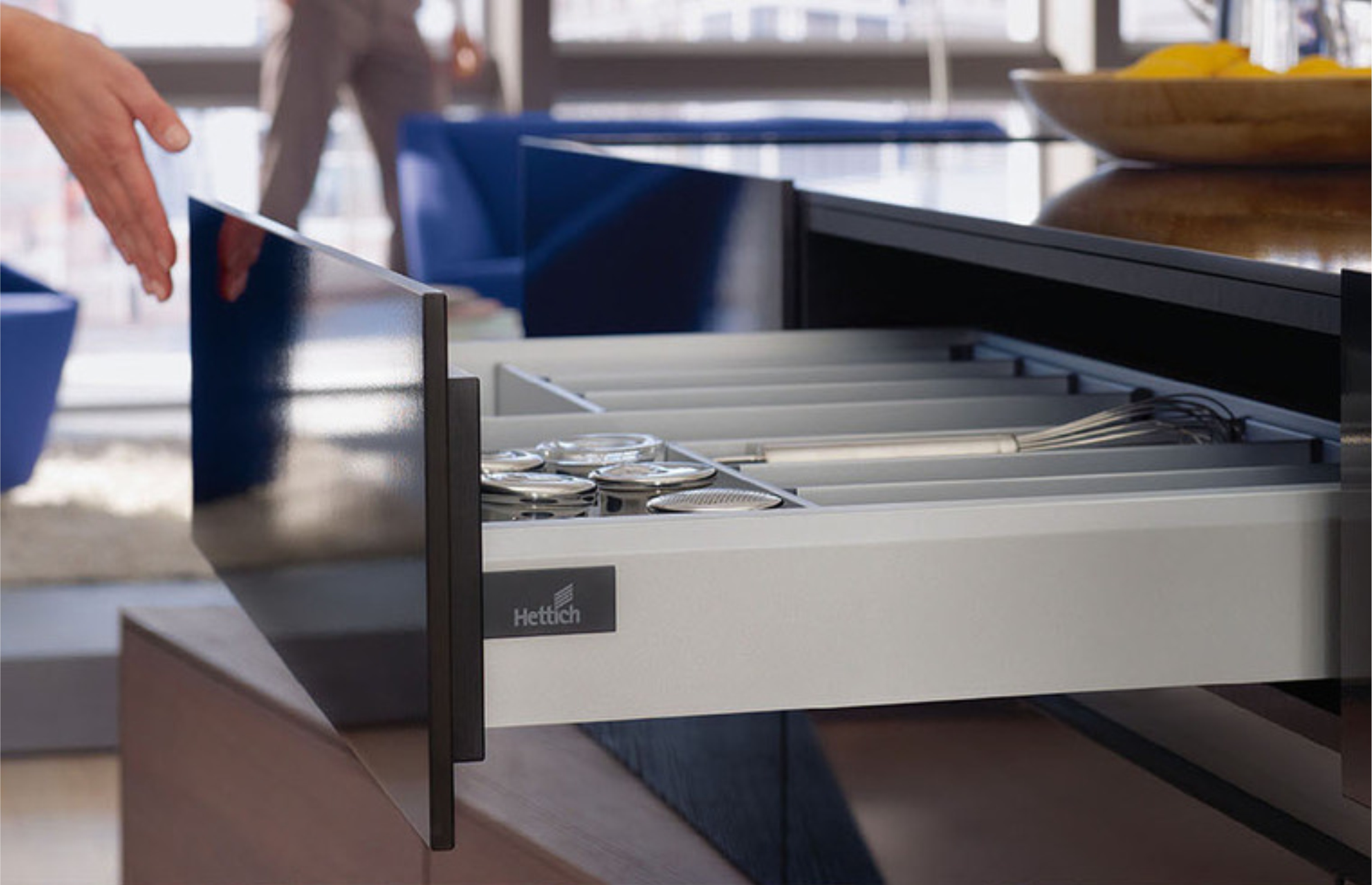 Pri výsuvoch sme stavili na kvalitu od špičkových značiek. Napríklad hladký chod výsuvov Quadro od firmy Hettich je neporovnateľný. Quadro využíva geniálnu myšlienku guličkového ložiska. Minimálne štyri rady oceľových guliček hladko bežia v presných oceľových profiloch. Ticho sa odvaľujú a precízne vedú každú zásuvku. Skrytá špičková technika pre najlepší nábytok. Hodnotu nábytku zvyšuje kombinácia s tlmením Silent System pre tiché zatváranie zásuviek.