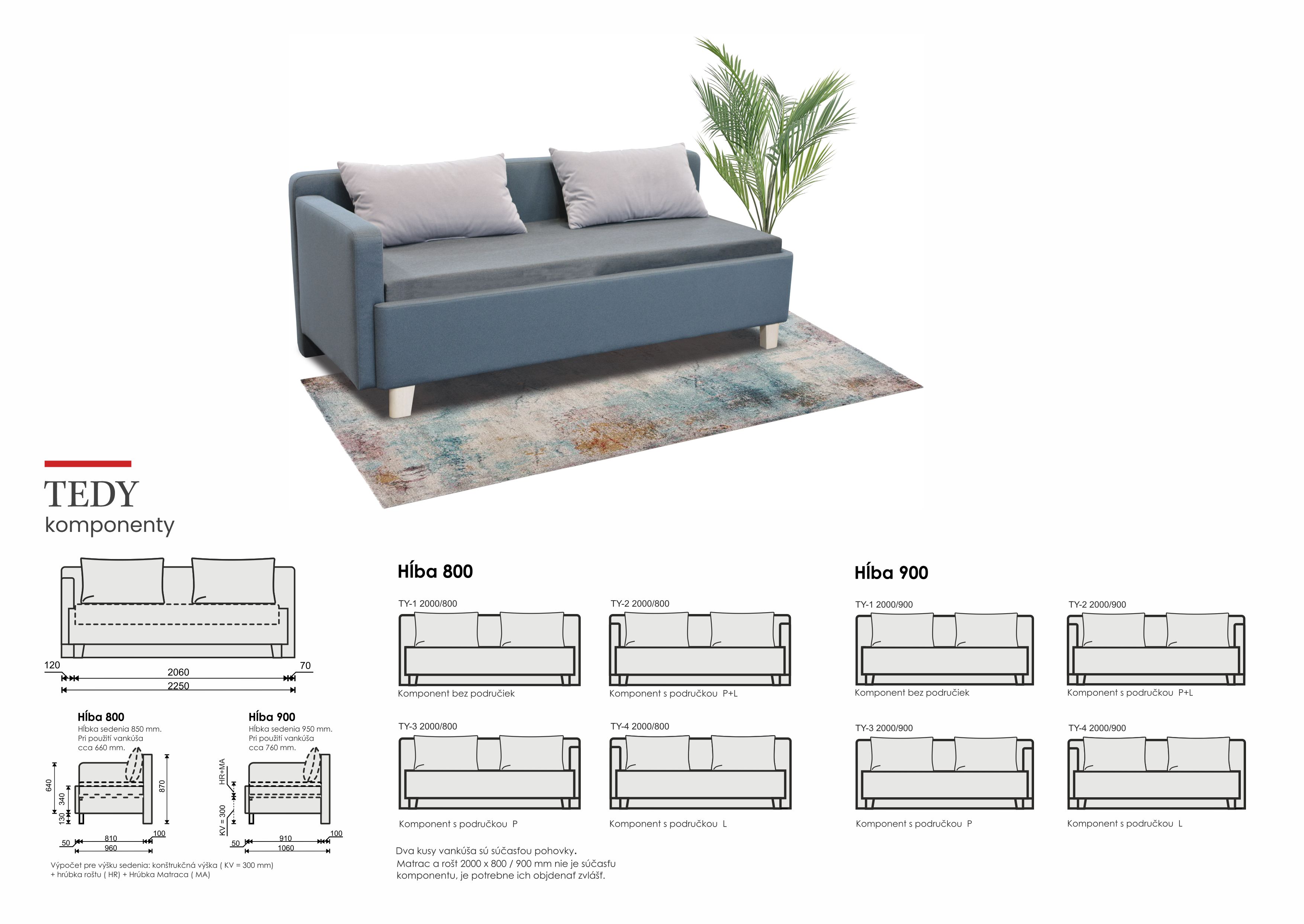 Čalúnená pohovka TEDY vyniká jednoduchými líniami. Ľahká manipulácia pri rozkladaní na spaciu plochu, ktorá je vhodná pre každodenné spanie s voliteľným matracom a veľkosťou.