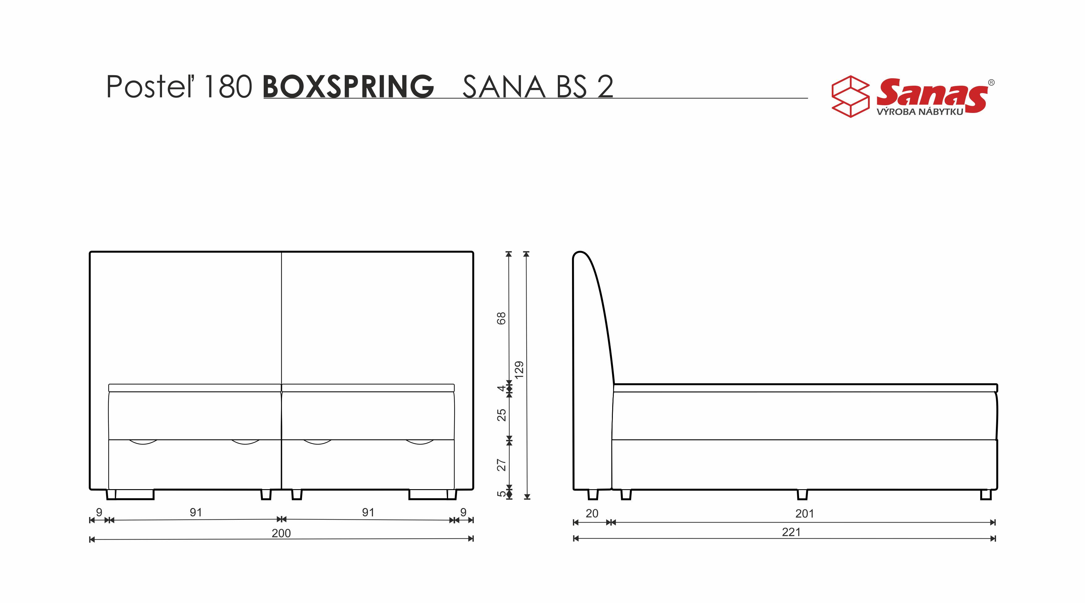 Pohodlná čalúnená boxspring posteľ Sana BS 2 s dvojitým pružinovým matracom, úložným priestorom a výklopom spredu dodá Vašej spálni luxusný vzhľad a ručné čalúnenie a šitie zaručí najlepšiu kvalitu. SANA BS 2 má čelo s jednoduchými čistými tvarmi a zvislým prešitím. Zadné čelo poskytuje dostatočný komfort počas sedenia, alebo čítania knihy.