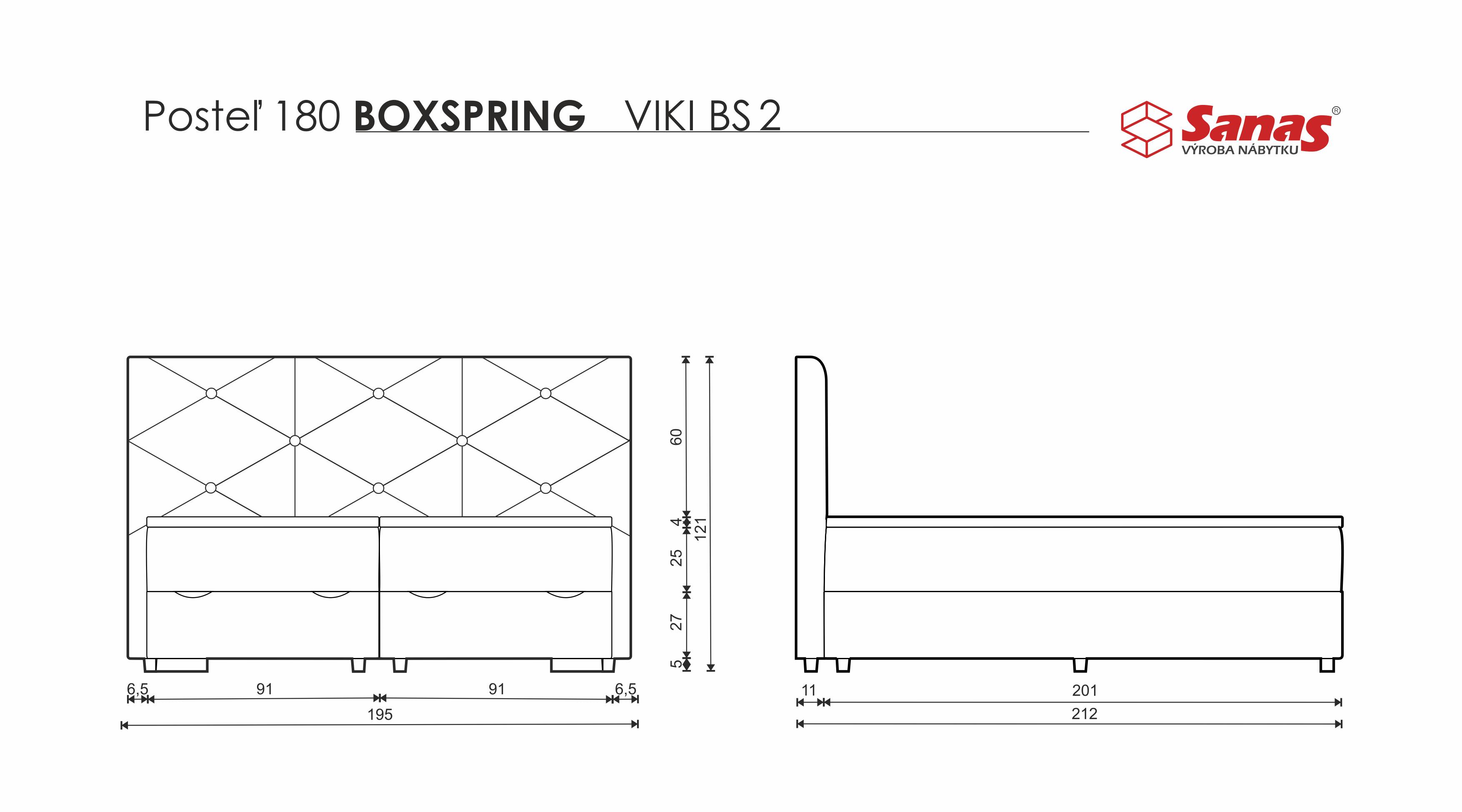 Pohodlná čalúnená boxspring posteľ Viki BS 2 s dvojitým pružinovým matracom, úložným priestorom a výklopom spredu dodá Vašej spálni luxusný vzhľad a ručné čalúnenie a šitie zaručí najlepšiu kvalitu. VIKI BS 2 má čelo s kosoštvorcovým prešitím doplneným o gombíky, čo jej pridáva honosný vzhľad. Zadné čelo poskytuje dostatočný komfort počas sedenia, alebo čítania knihy.