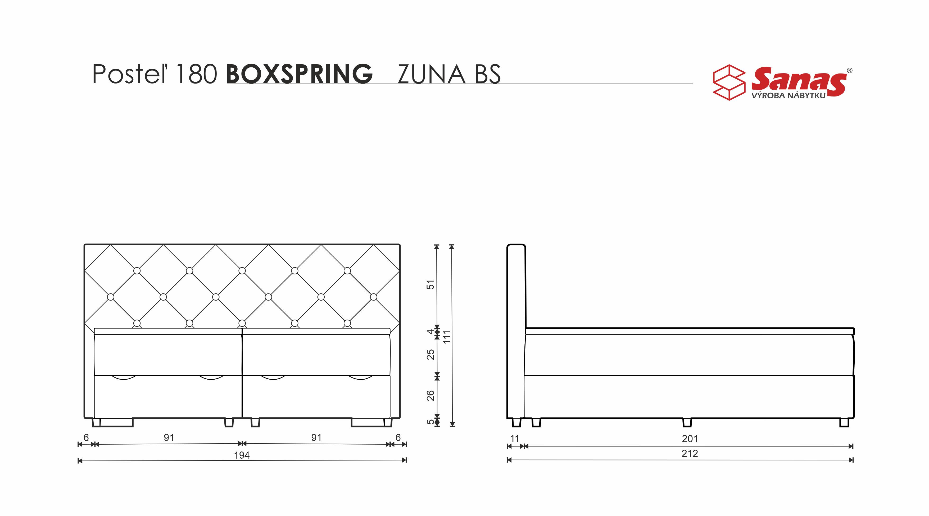 Pohodlná čalúnená boxspring posteľ Zuna BS s dvojitým pružinovým matracom, úložným priestorom a výklopom spredu dodá Vašej spálni luxusný vzhľad a ručné čalúnenie a šitie zaručí najlepšiu kvalitu. Zuna BS má čelo s kosoštvorcovým prešitím doplneným o gombíky, čo jej pridáva honosný vzhľad. Zadné čelo poskytuje dostatočný komfort počas sedenia, alebo čítania knihy.