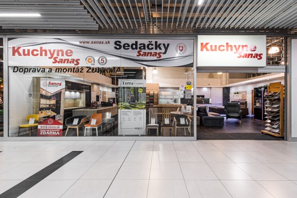 Predajňa sa nachádza na 2. poschodí v ZOC MAX .Na predajnej ploche 100 m2 vám ponúkame kompletný sériový výrobný sortiment f. Sanas, a.s. za vynikajúce ceny. Predajňa je najviac na predaj kuchynských liniek SANAS a sedačiek SANAS, ale zastúpený je aj kompletný sortiment bytového nábytku, obývacie steny, komody, predsiene, postele, spálne, šatníkové skrine, sedacie súpravy, stoly, stoličky, kancelársky nábytok, bytové doplnky. V každom ročnom období vám ponúkame jedinečné zľavy na vybraný sortiment. Radi Vás preto privítame. Parkovanie pre zákazníkov je na parkoviskách ZOC MAX Žilina.