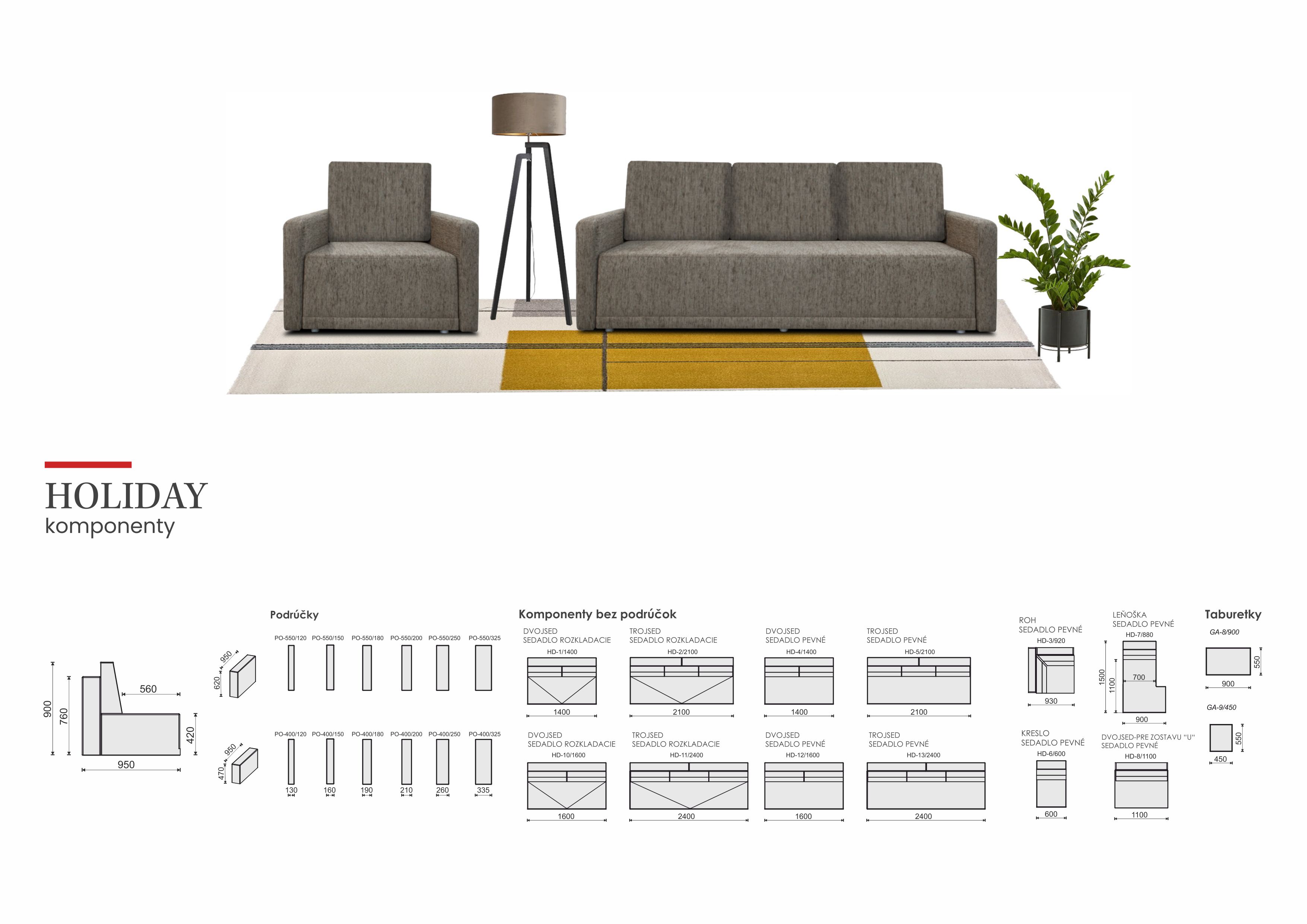 HOLIDAY je moderná kombinovateľná rozťahovacia sedačka. Tento model má k dispozícii viac modulov, a preto je možné kombinovať viacero kombinácií podľa potreby. Na výber je k dispozícii viac ako 200 látok v troch cenových kategóriach. Vnútro sedenia tvorí tzv. pružinový sendvič.
